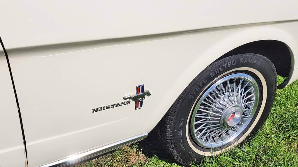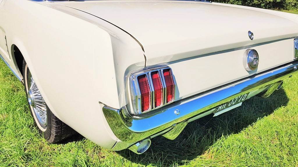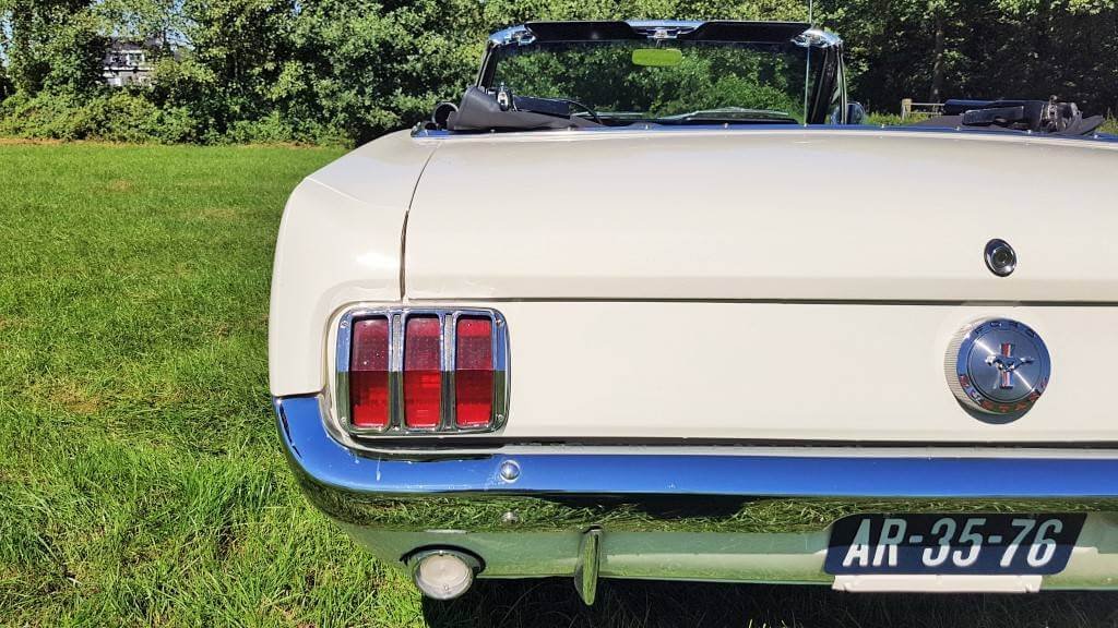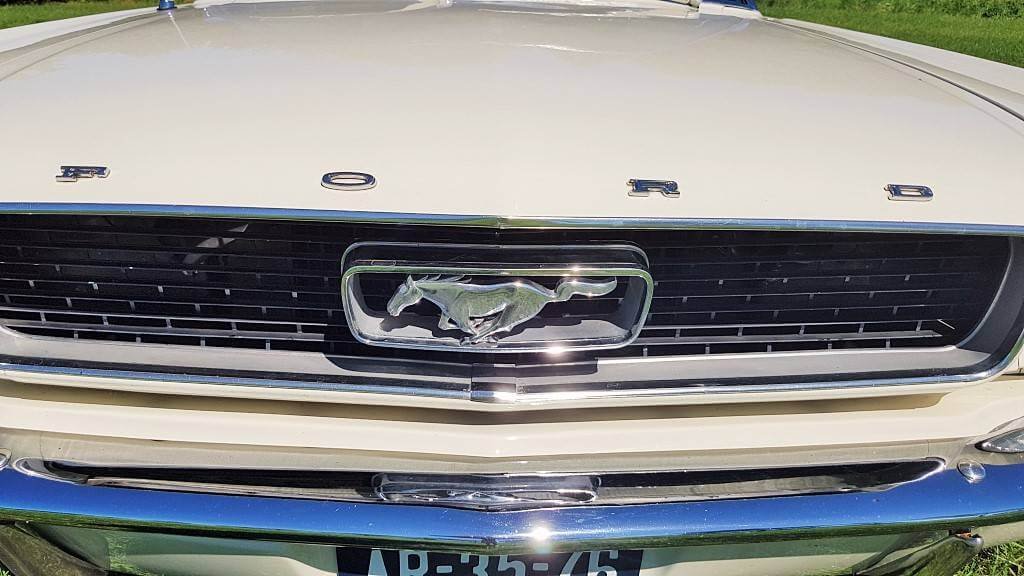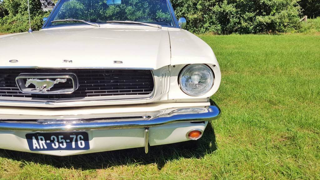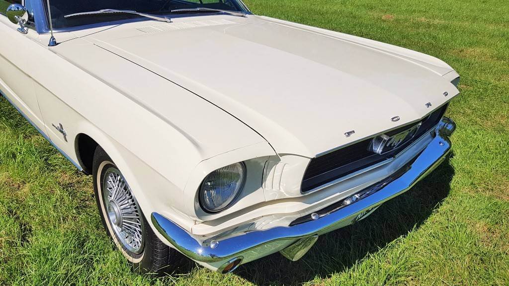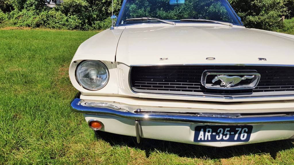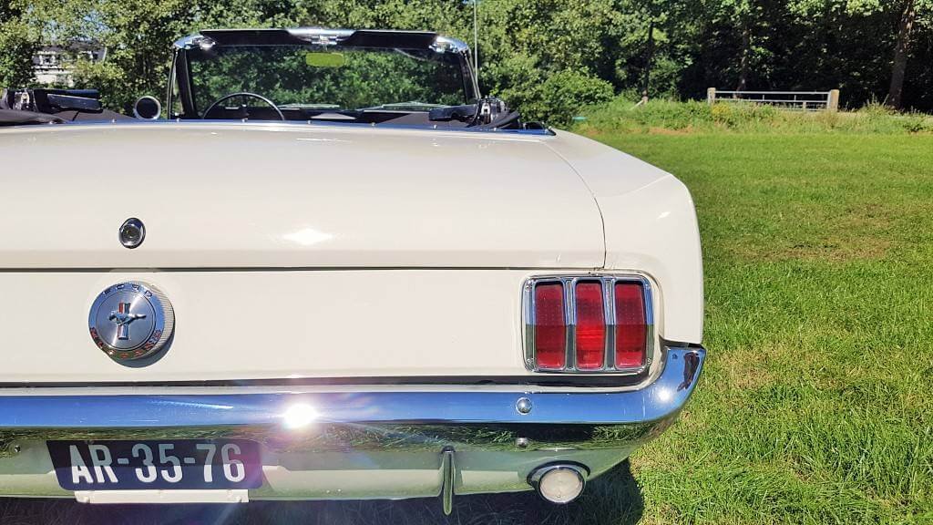 Dat deze oldtimer Ford Mustang nog niet zoveel kilometers op de teller heeft, zie je ook als je de buitenkant van de auto bekijkt. De lak is in topconditie. (De kleine dingetjes vertellen het verhaal van deze auto met een verleden. Maar hij heeft een lage kilometerstand en dat zorgt ervoor dat jullie tijdens de bruiloft in een schitterende auto rijden.)