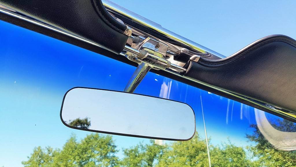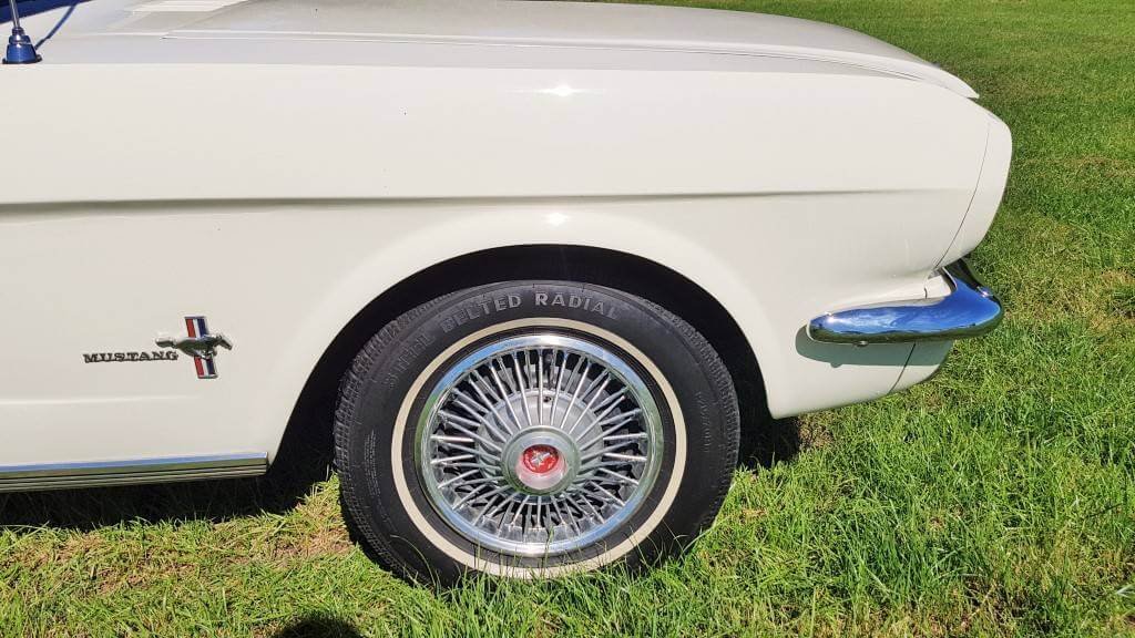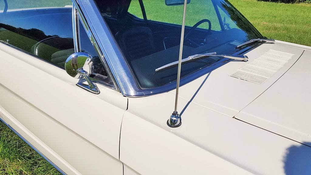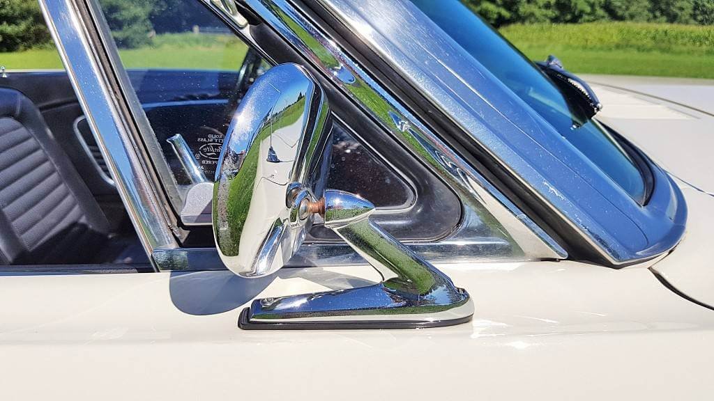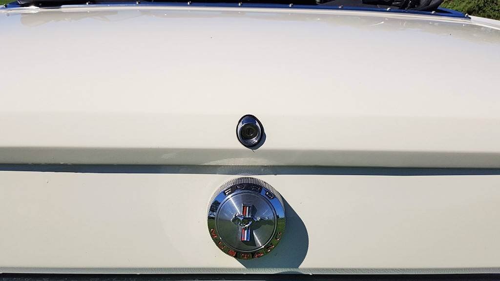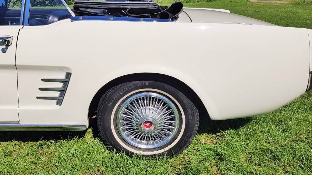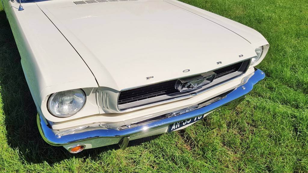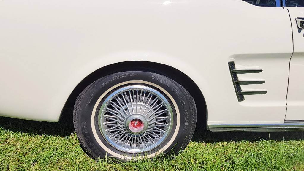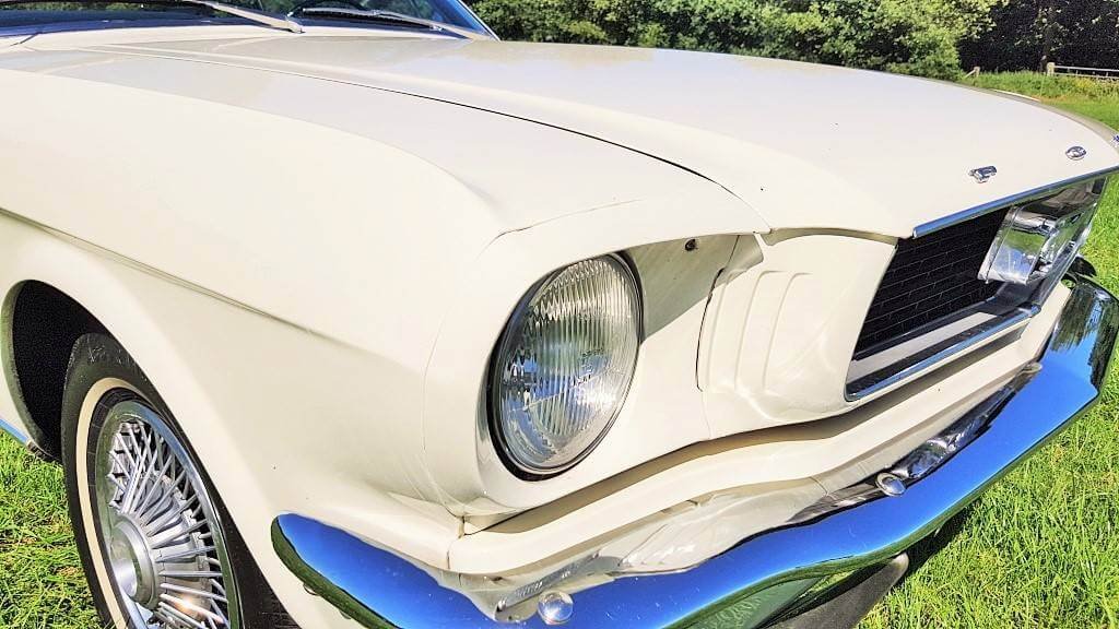 Dat deze oldtimer Ford Mustang nog niet zoveel kilometers op de teller heeft, zie je ook als je de buitenkant van de auto bekijkt. De lak is in topconditie. (De kleine dingetjes vertellen het verhaal van deze auto met een verleden. Maar hij heeft een lage kilometerstand en dat zorgt ervoor dat jullie tijdens de bruiloft in een schitterende auto rijden.)